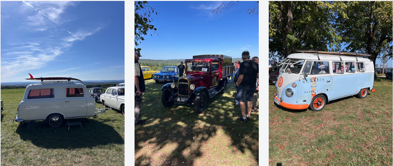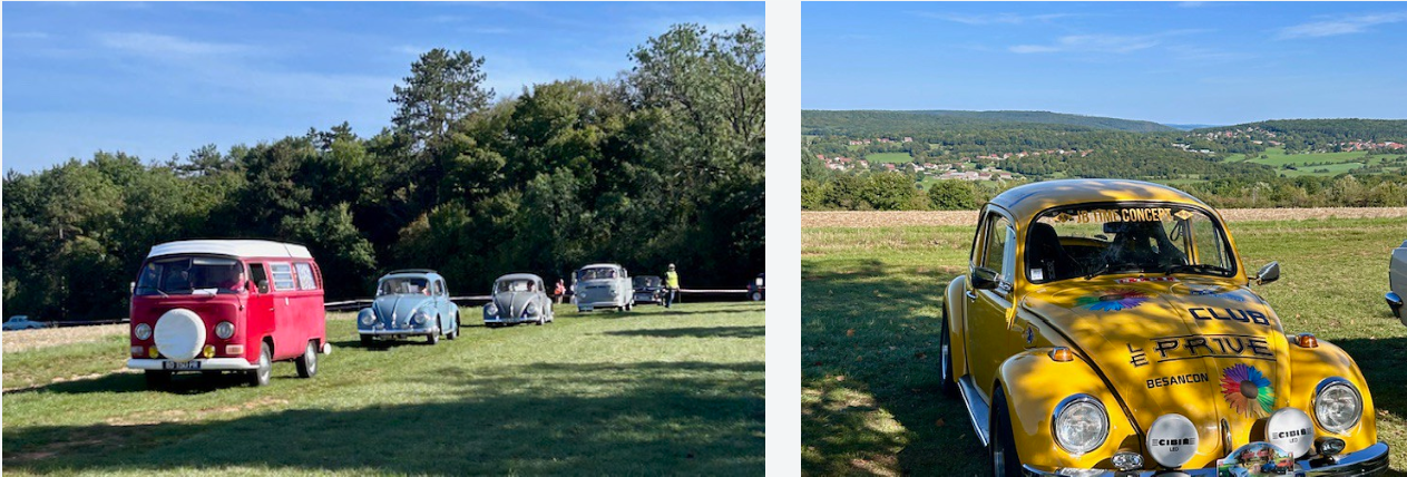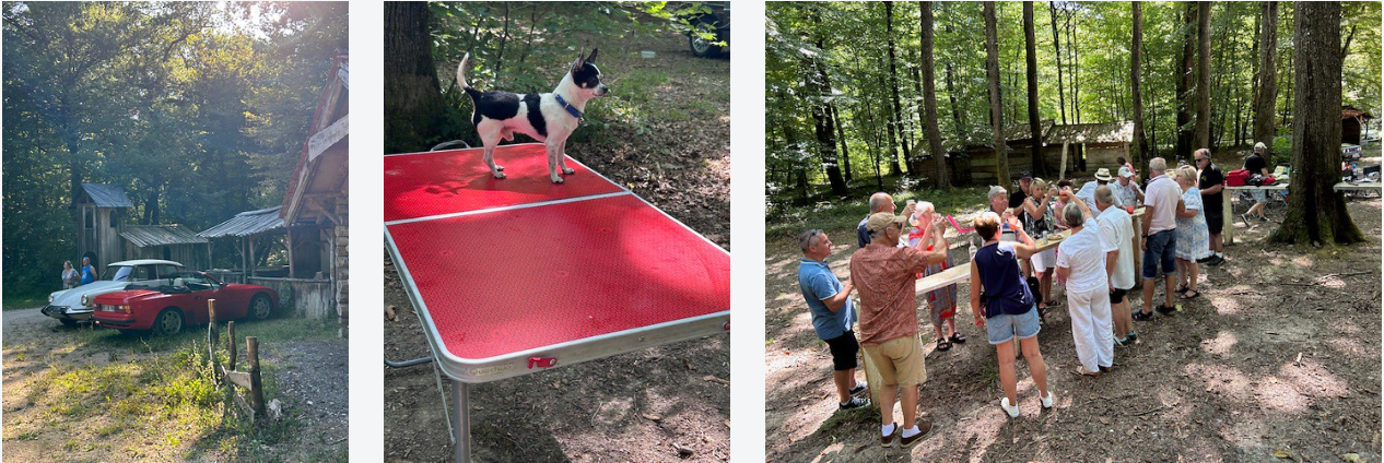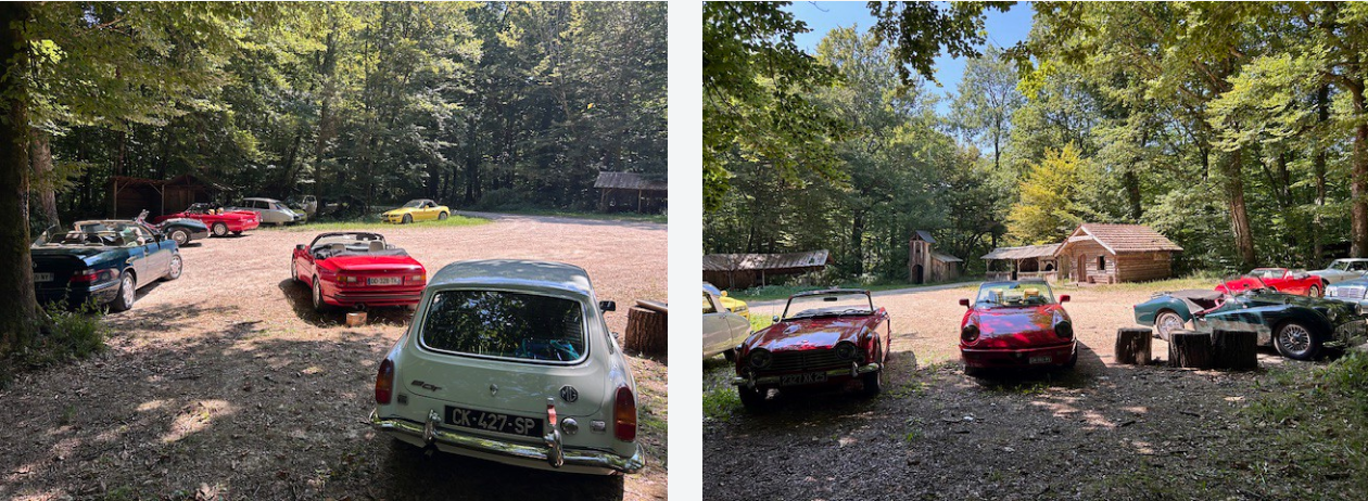 Après le rassemblement, à l'initiative de Patrick, quinze équipages sont partis en convoi et ont rejoint une clairière en forêt de Chaux pour un pique-nique à l'ombre ponctué de balades et de jeux ,très bonne ambiance conviviale, au frais sous les arbres.